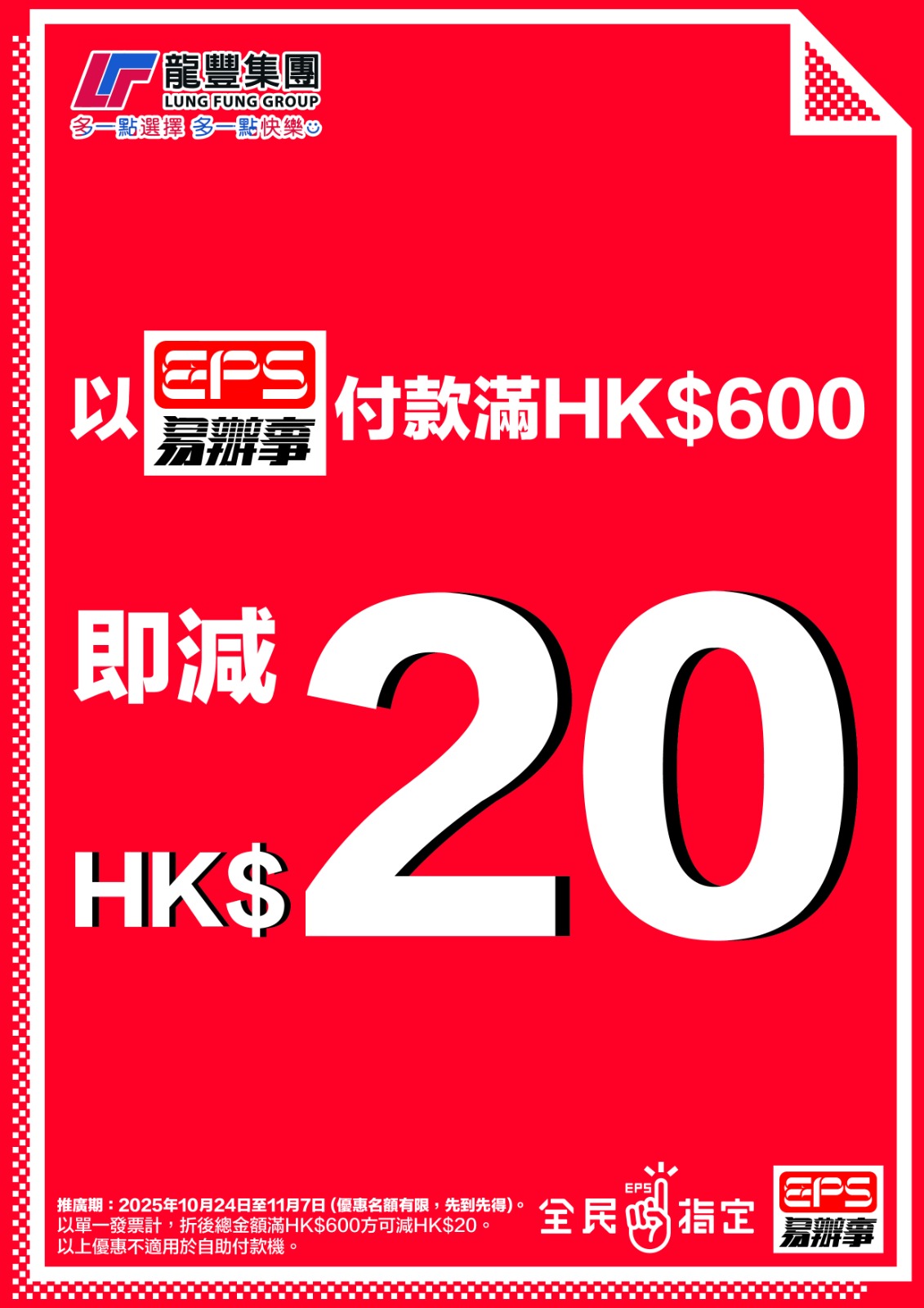 以EPS 單一消費滿HK$600或以上,即減HK$20
