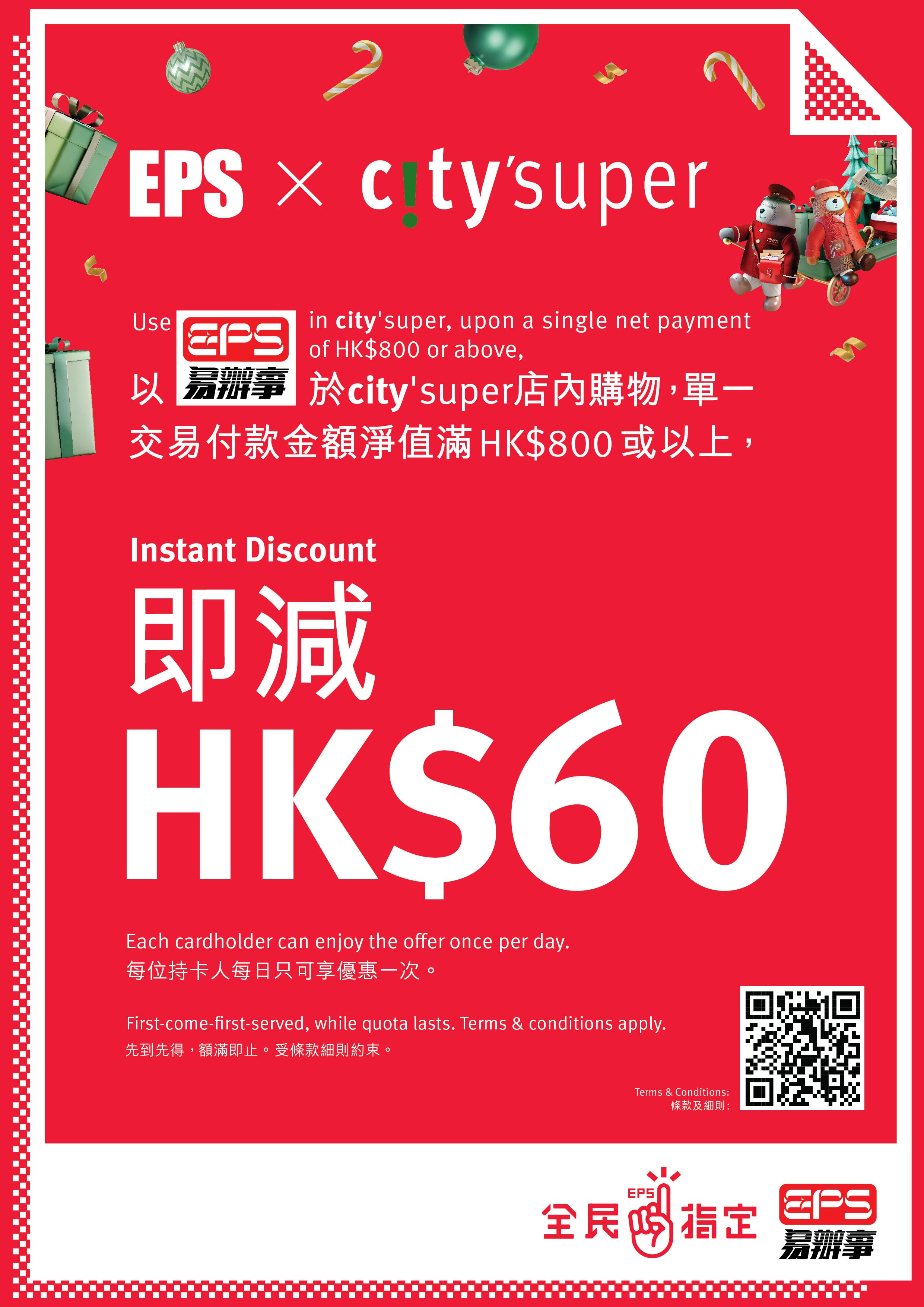 以EPS於city’super店內購物,單一交易付款金額淨值滿HK$800或以上,即減HK$60。每位持卡人每日只可享優惠一次。先到先得,額滿即止。受條款細則約束。詳情請向店內職員查詢。