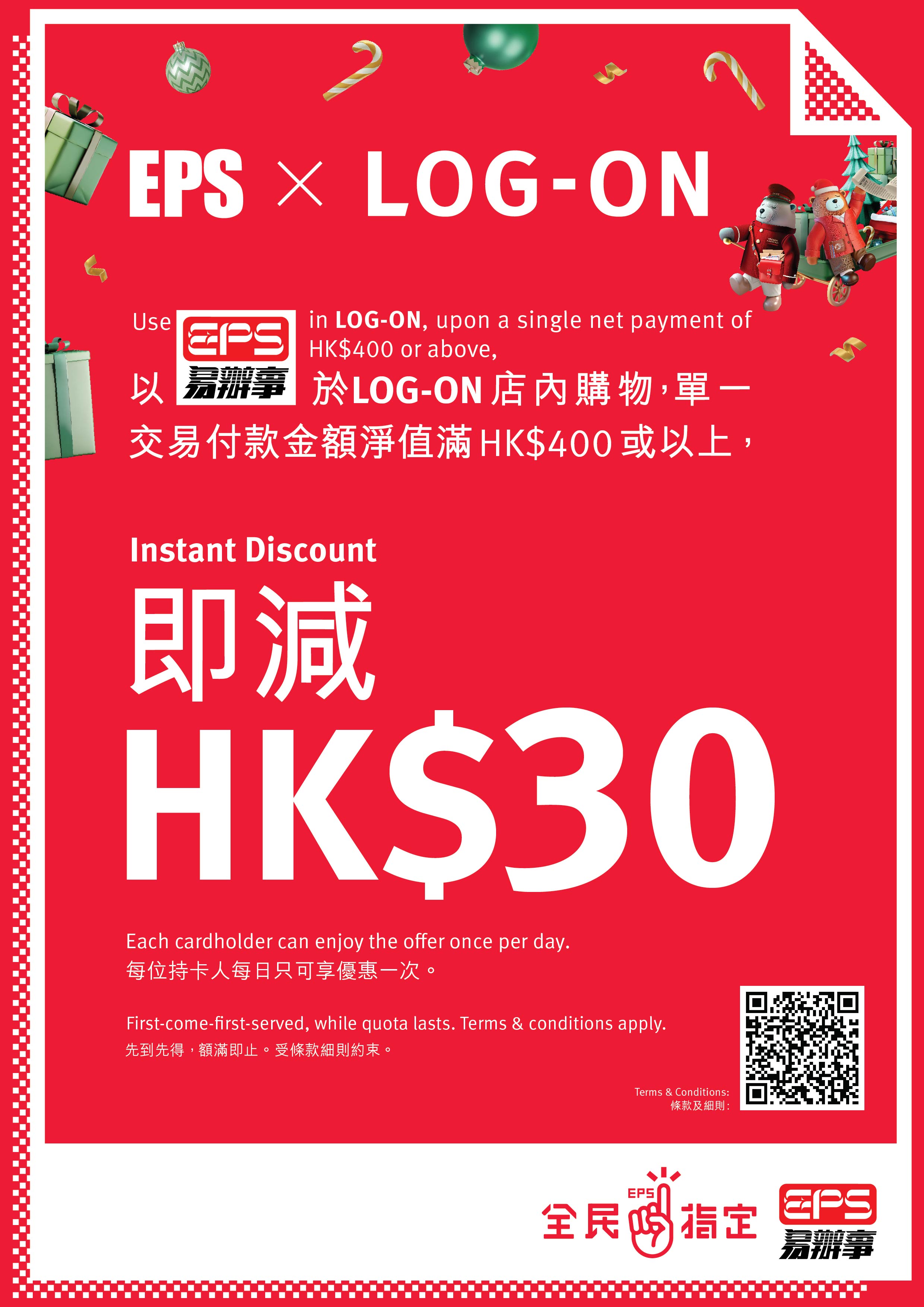 以EPS於LOG-ON店內購物,單一交易付款金額淨值滿HK$400或以上,即減HK$30。每位持卡人每日只可享優惠一次。先到先得,額滿即止。受條款細則約束。詳情請向店內職員查詢。